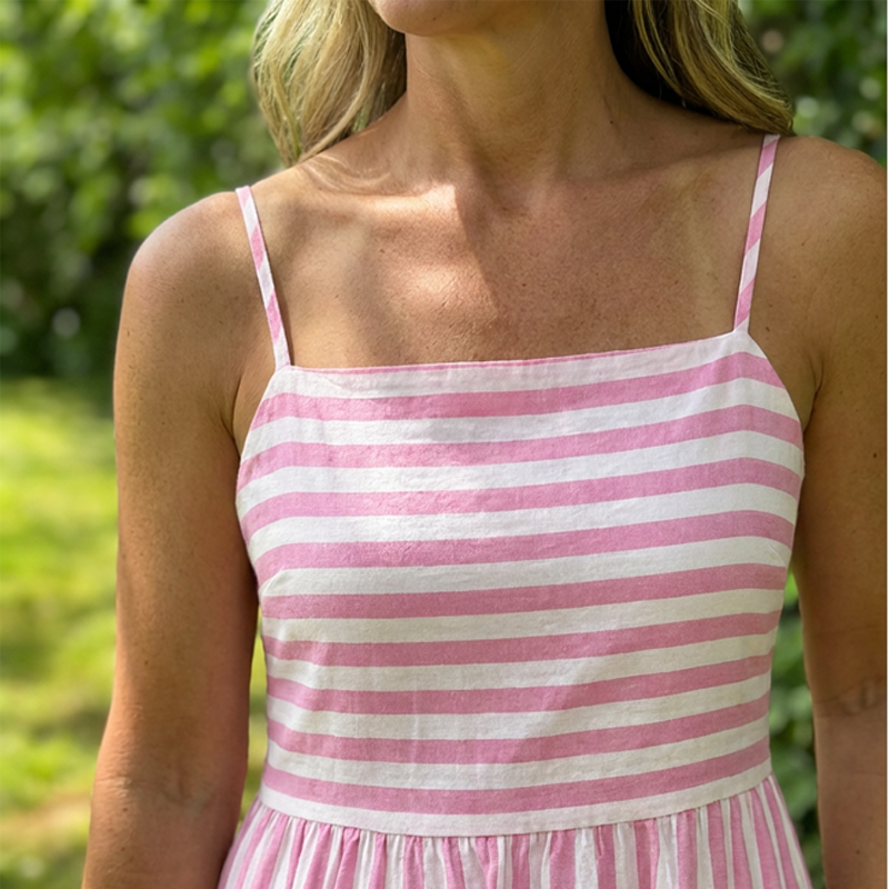 PRODYŠNÁ PRUHOVANÁ LÁTKA- Vyrobeno z lehké a prodyšné pruhované polyesterové tkaniny. Udržuje vás v chladu a pohodlí v teplém počasí a zároveň nabízí strukturovaný, vizuálně zajímavý vzhled, který se snadno nemačká.